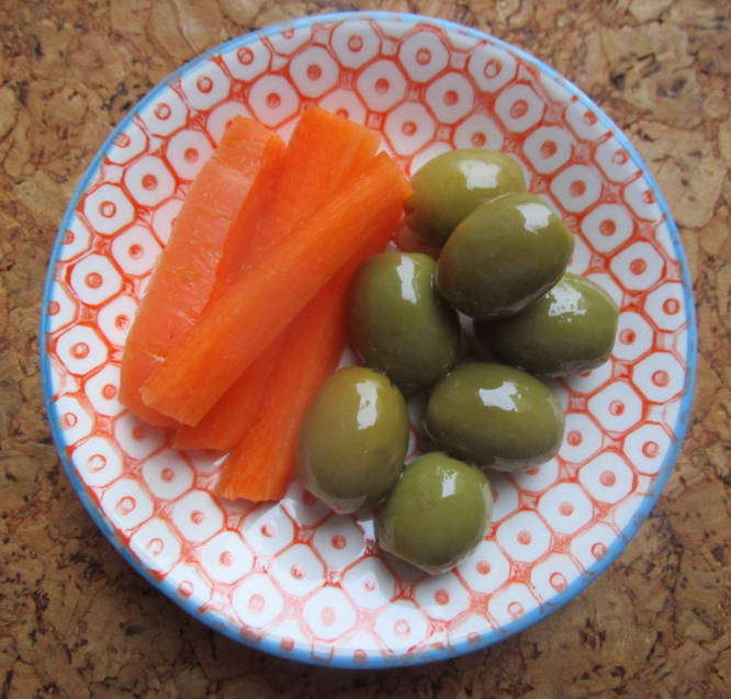 Carrot sticks, cherry tomatoes, cucumber slices, weeny handful of still-frozen peas or still-frozen sweetcorn, pepper sticks, sugar snap peas, olives, celery sticks, avocado … anything you like! Don’t stick to veg they already eat happily – that defeats the object! But just a couple of different things each time is enough at first so as not to be overwhelming.