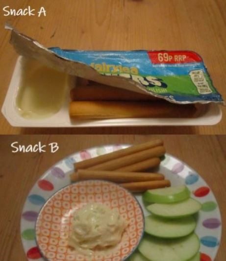 Making the effort to arrange the snack on a plate with a blob of Dairylea in a little dish and an apple cut into in slices makes the snack more of a ‘thing’. It gently conveys to your child a feeling of care, nurture, interest and respect around food and eating that is missing from the packet snack grabbed from the cupboard!